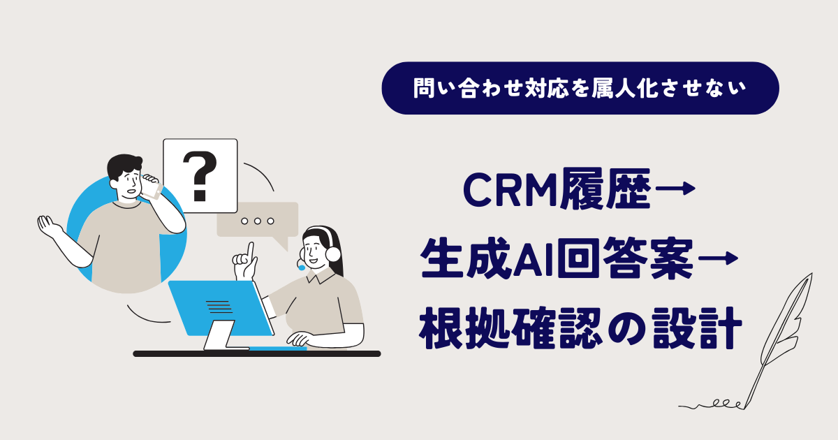 問い合わせ対応の属人化は、個人の努力ではなく、情報と工程の分断から生まれます。解決の中心は、CRM履歴→生成AI回答案→根拠確認を一本化し、確認と承認を工程として組み込むことです。