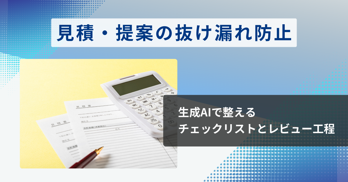 見積・提案の抜け漏れ防止で先に整えるべきなのは、AIそのものではなく、確認観点とレビュー工程です。どこを見て、いつ誰が確認するかが曖昧なままでは、生成AIを使っても品質は安定しません。